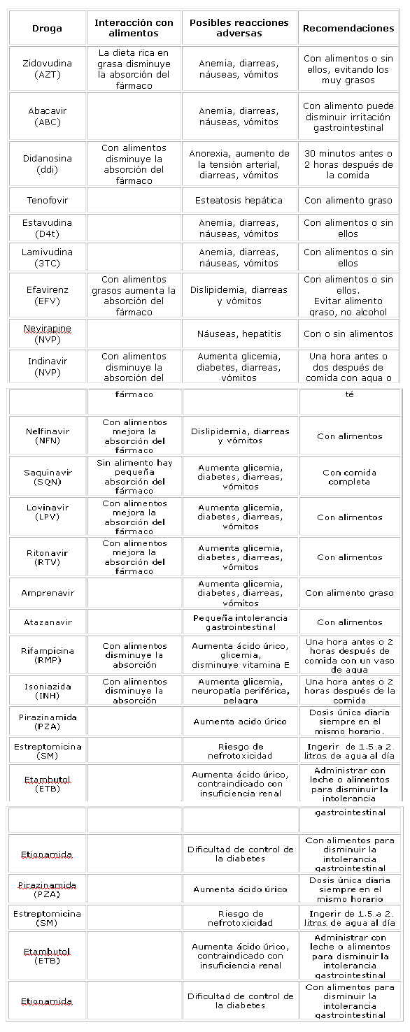 Asimismo, en dependencia de los retrovirales indicados, se recomienda que deben ser ingeridos con mayor o menor cantidad de alimentos, para disminuir la irritación gastrointestinal, como son los casos del abacavir (ABC), del nelfinavir (NFN) o el saquinavir (SQN).
